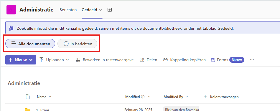 Het vernieuwde tabblad biedt gebruikers de keuze tussen twee invalshoeken. De bibliotheekweergave toont de vertrouwde mappenstructuur vanuit SharePoint, aangevuld met de mogelijkheid om snel naar bestanden in andere kanalen van hetzelfde team te navigeren. De berichtenweergave verzamelt juist alles wat via kanaalcommunicatie is gedeeld, een functie die tot nu toe alleen in één-op-één chats bestond.